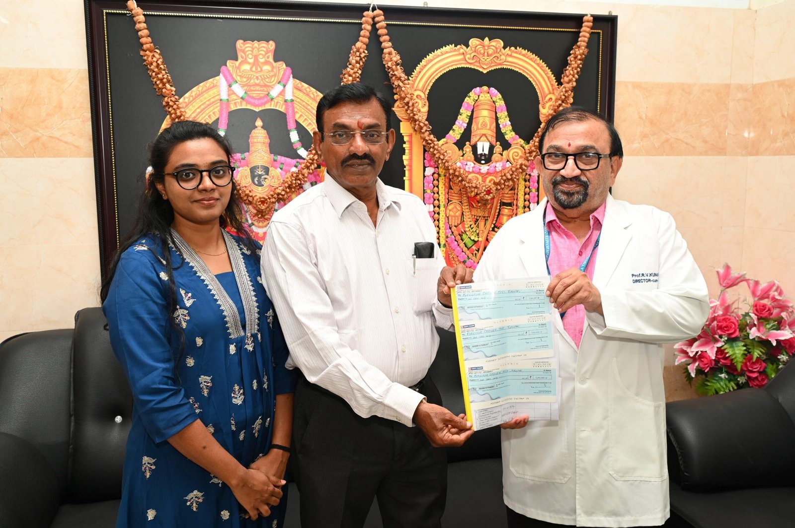 శ్రీ వెంకటేశ్వర వైద్య విజ్ఞాన సంస్థ (స్విమ్స్) ఆసుపత్రికి స్విమ్స్ బాలాజి ఆరోగ్య వరప్రసాదిని పథకానికి తిరుపతి నగరానికి చెందిన యం. కిషోర్ కుమార్ “లలిత్ ఇన్నోవేషన్ ఫుడ్ ప్రై. లిమిటెడ్. అధినేత స్విమ్స్ హాస్పిటల్ పేద రోగులకు అందిస్తున్న వైద్య సేవలను పరిగణలోనికి తీసుకొని 3 లక్షలు రూపాయలు విరాళం అందించినట్టు తెలిపారు. దాత తరపున తిరుపతి వాస్తవ్యులు వై. రాఘవేంద్ర చేతుల మీదుగా ఈ విరాళం అందించారు. మూడు చెక్కుల రూపంలో బుధవారం స్విమ్స్ డైరెక్టర్ కార్యాలయంలో సంచాలకులు, ఉపకులపతి డా॥ ఆర్.వి.కుమార్ కు అందజేశారు. ఈ సందర్భంగా విరాళ దాతకు ప్రత్యేక కృతజ్ఞతలు తెలియజేసి, ఇచ్చిన విరాళాన్ని పేద రోగుల వైద్య సేవలకు ఉపయోగిస్తామని తెలియజేశారు .